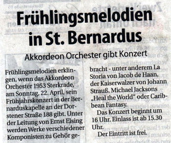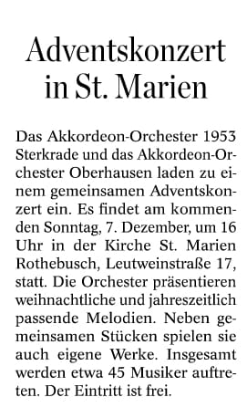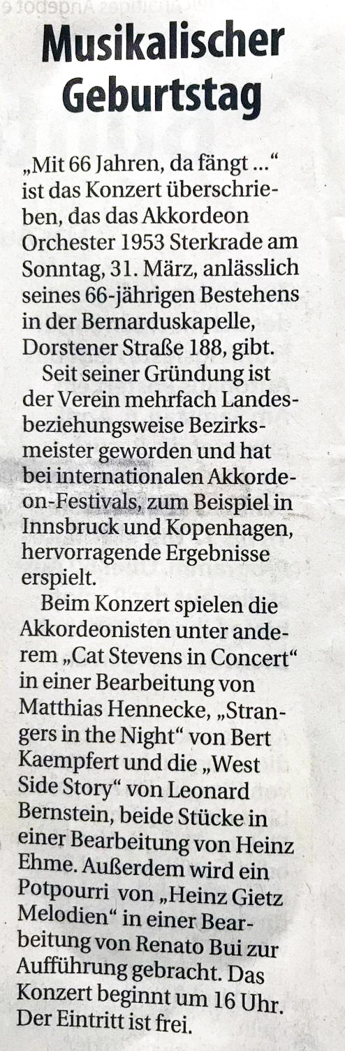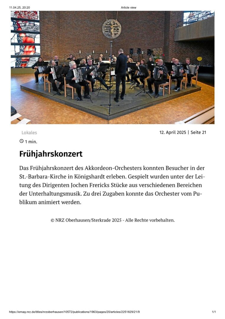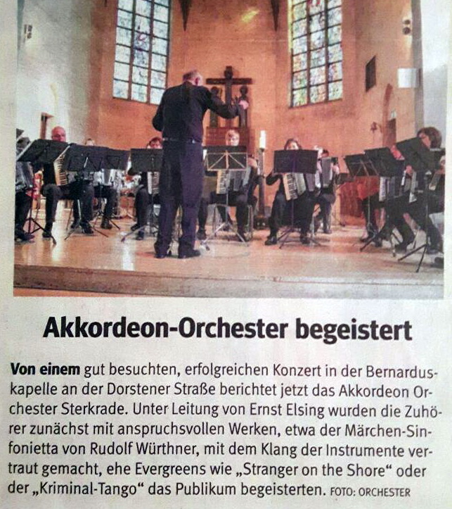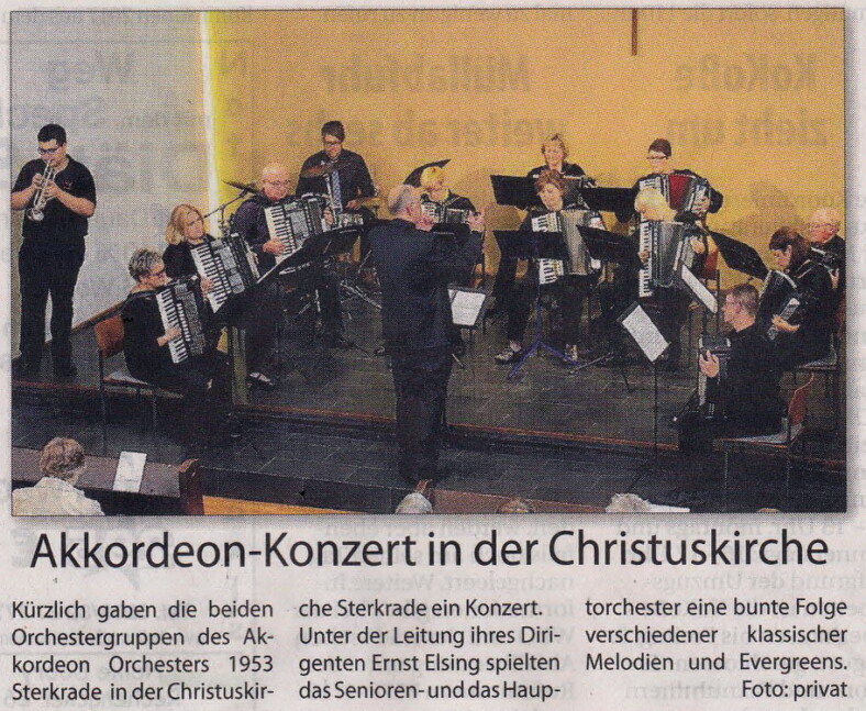 Oberhausen. Praktisch ausverkauftes Haus meldete das Akkordeon-Orchester 1953 Sterkrade beim traditionellen Frühjahrskonzert in der St. Barbara-Kirche in Königshardt. Über eine Stunde lang unterhielt das Orchester mit seinen 25 Aktiven unter der musikalischen Leitung des Dirigenten Jochen Frericks die Zuhörer mit musikalischen Klängen aus verschiedenen Bereichen der Unterhaltungsmusik. Dabei wurden die Akkordeonspieler durch Keyboards und Percussion unterstützt. Drei Zugaben musste das Orchester liefern. Für das nächste Jahr ist bereits eine Neuauflage mit neuen Stücken geplant.