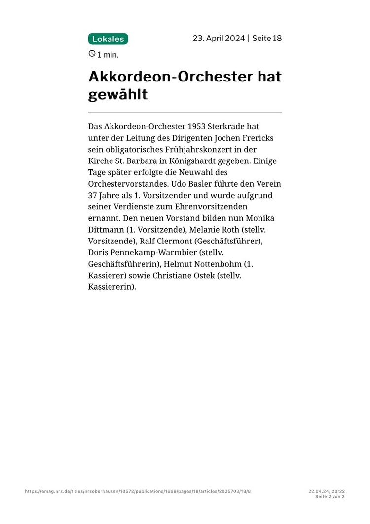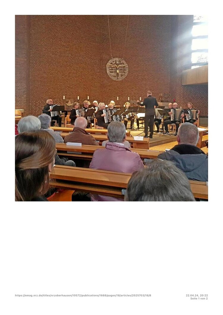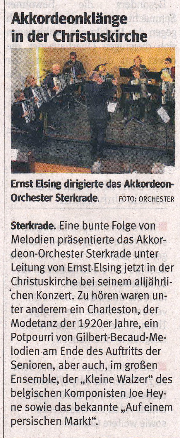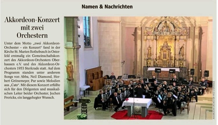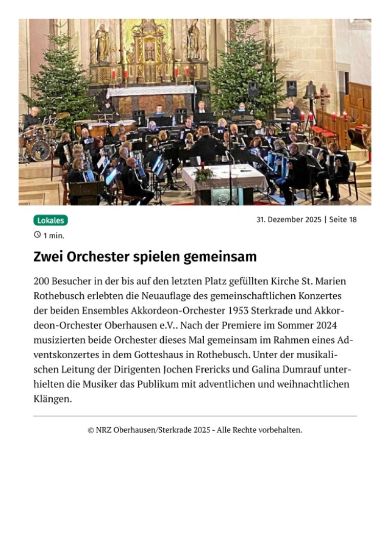 Oberhausen. Praktisch ausverkauftes Haus meldete das Akkordeon-Orchester 1953 Sterkrade beim traditionellen Frühjahrskonzert in der St. Barbara-Kirche in Königshardt. Über eine Stunde lang unterhielt das Orchester mit seinen 25 Aktiven unter der musikalischen Leitung des Dirigenten Jochen Frericks die Zuhörer mit musikalischen Klängen aus verschiedenen Bereichen der Unterhaltungsmusik. Dabei wurden die Akkordeonspieler durch Keyboards und Percussion unterstützt. Drei Zugaben musste das Orchester liefern. Für das nächste Jahr ist bereits eine Neuauflage mit neuen Stücken geplant.